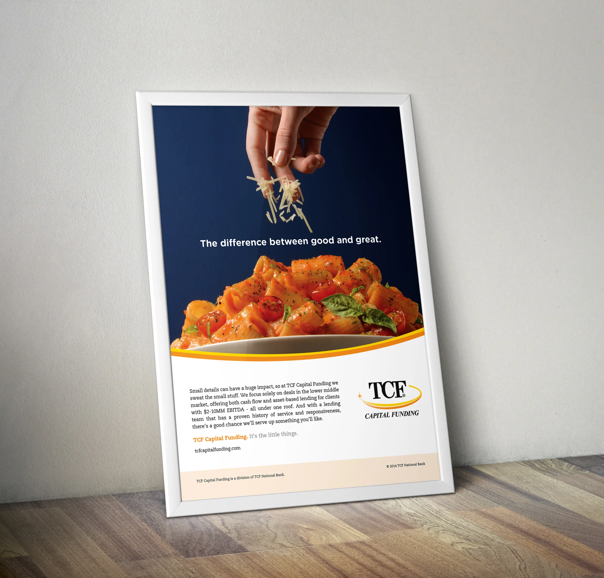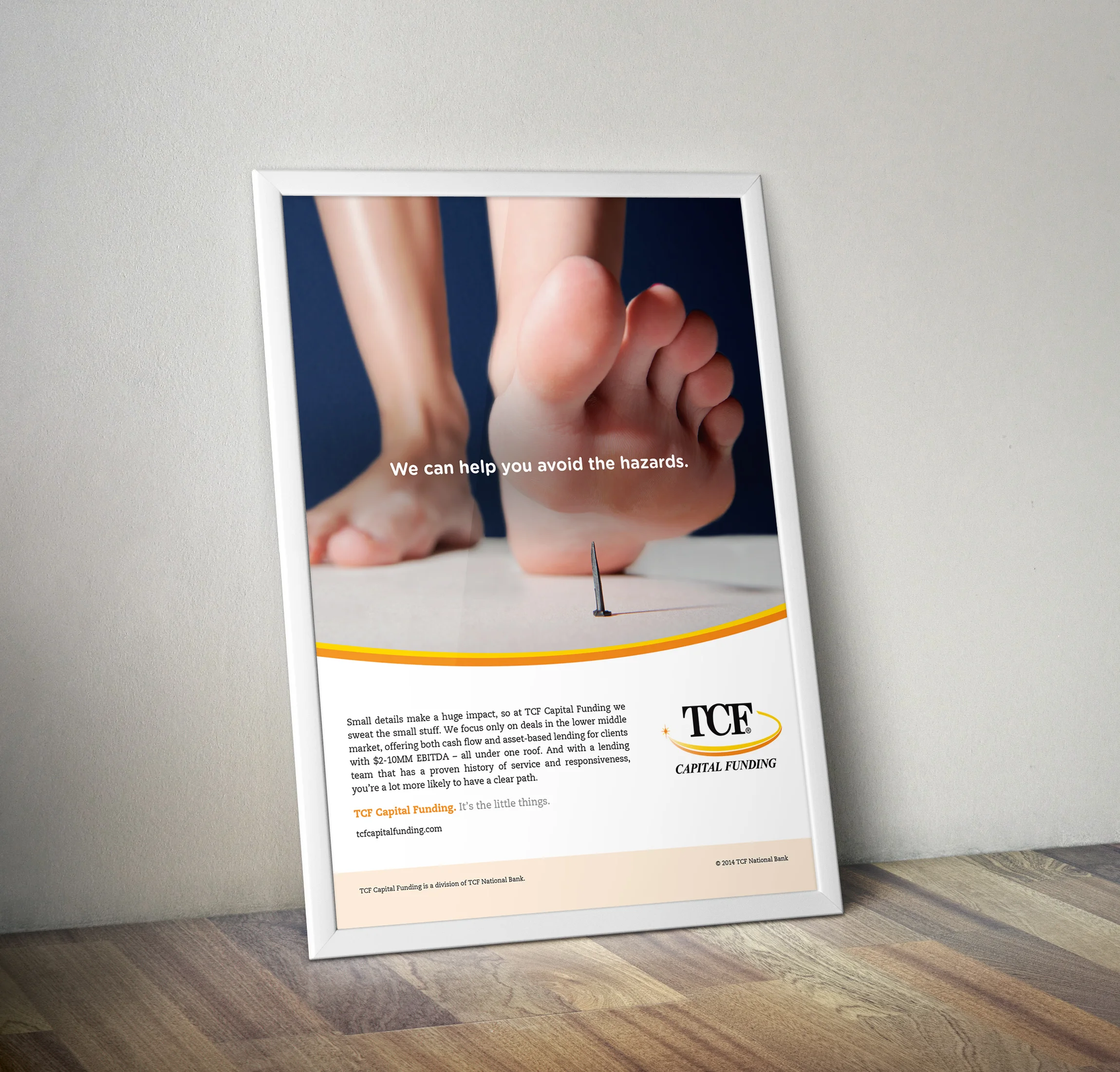 Designed to build off of TCF Capitals tag line "It's the little things," the 2014 ads were designed to incorporate the TCF swoosh coupled with that tiny touch the takes something from good to great, helps you avoid danger, or knows precisely how soft one has to be. Coupled with the ad campaign was an animated video used as a sales tool and residing on TCF Capital's website.